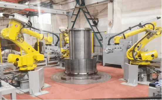 定子铁心叠装机器人工作单元,配备2D+3D视觉识别系统以及六轴关节机器人等设备,实现了电机定子铁心的自动叠装。